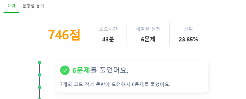 하지만 지난번 보다 일찍 문제를 틀려서 746점으로 내려갔는데, HashMap을 사용하는 문제였다.