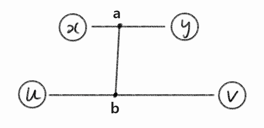 (b) 노드 x와 노드 y를 연결하는 경로가 노드 u와 노드 v를 연결하는 경로가 완전히 독립인 경우