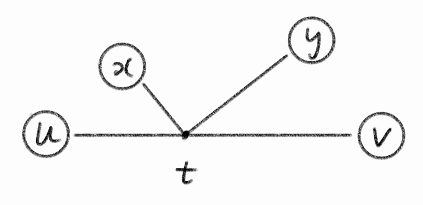 (a) 노드 x와 노드 y를 연결하는 경로가 노드 u와 노드 v를 연결하는 경로가 한 점 이상 공유하는 경우