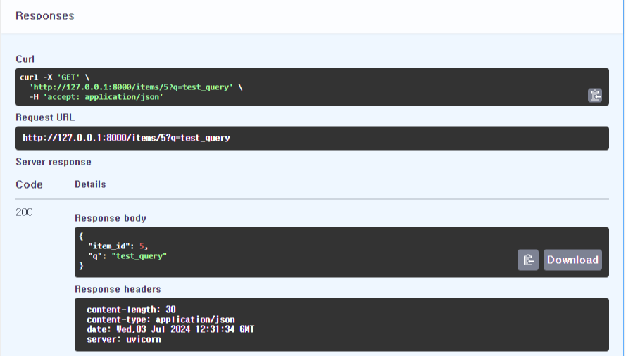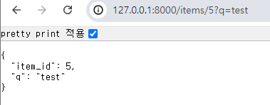 - 브라우저로 http://127.0.0.1:8000/items/5?q=test를 열어보면 아래와 같은 json 응답을 받을 수 있다.