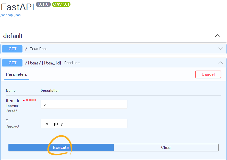 - Try it out 버튼을 누르면 매개변수를 채울 수 있고, Execute 버튼을 누르면 API와 통신하고 매개변수를 전송하여 결과를 가져와 화면에 표기해 준다.