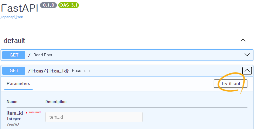 - 브라우저로 http://127.0.0.1:8000/docs를 열어보면 자동 대화형 API 문서를 확인할 수 있다.