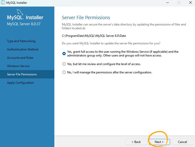 - Server File Permissions는 서버 파일에 대한 권한을 설정하는 것이며, 기본 설정으로 선택하고 Next를 누른다.