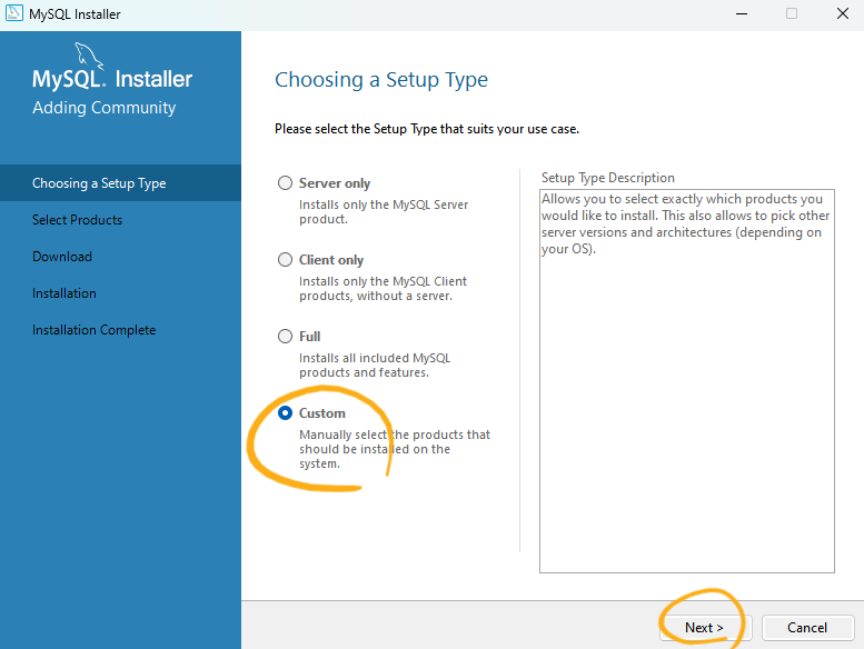 - MySQL Installer 창이 나타나면, 제일 먼저 setup type을 설정하는데 "Custom"을 선택하고 Next를 누른다.