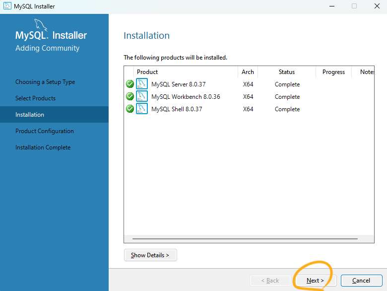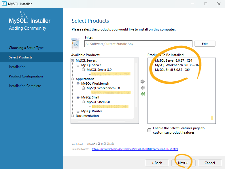 - Select Products에서는 MySQL의 Server와 Workbench, Shell을 선택하고 Next를 누른다.