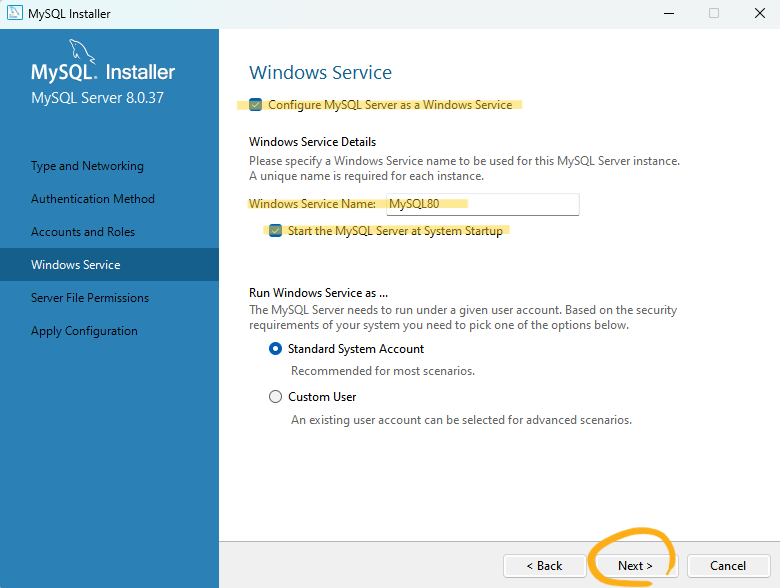 - Windows Service에서는 체크가 제대로 잘 되어있는지 확인하면 된다. 이외에 Service Name은 MySQL80을 그대로 사용해도 되고, MySQL로 바꾸어 사용해도 좋다. 완료되었다면 Next를 누른다.