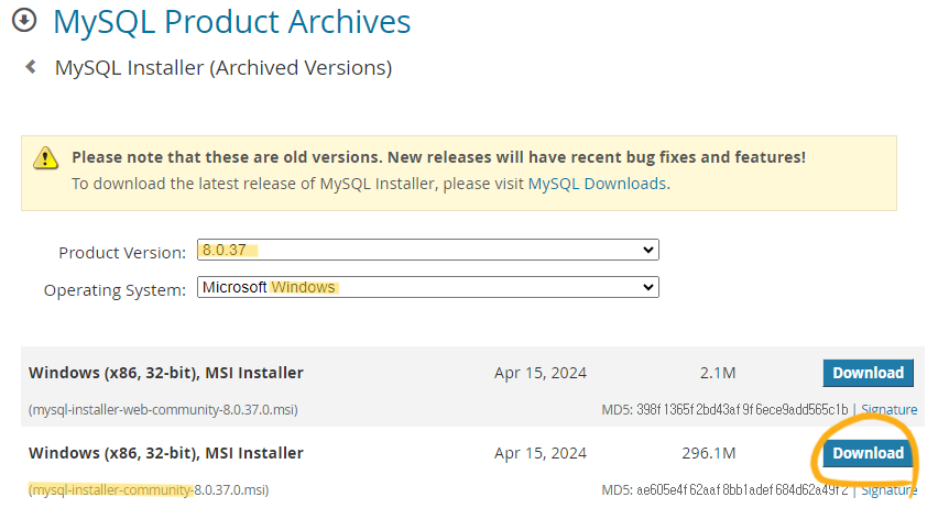 - 여기에선 8.0.37 버전과 Windows OS를 선택했다. (24년 7월 기준)