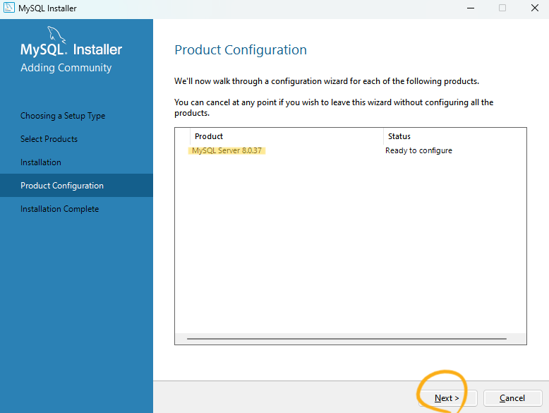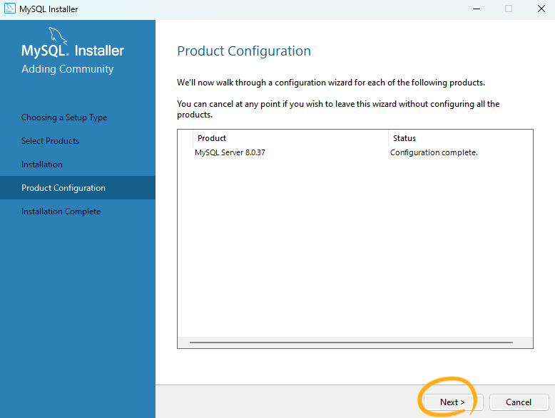 - 설치가 완료되면 Next를 눌러 Product Configuration 단계로 이동한다.