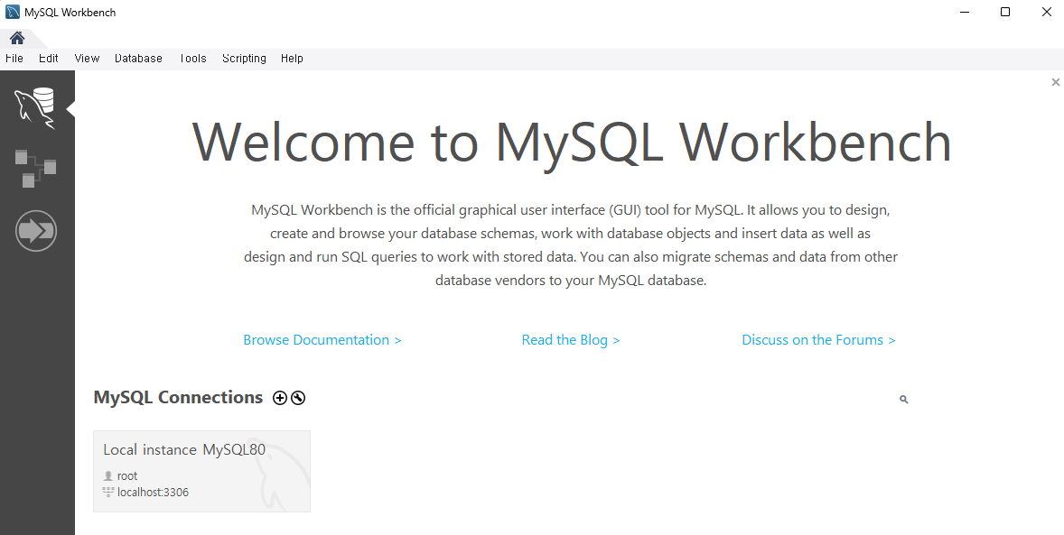 - Start MySQL Workbench after setup를 체크했다면 바로 아래와 같이 워크벤치가 열린다.