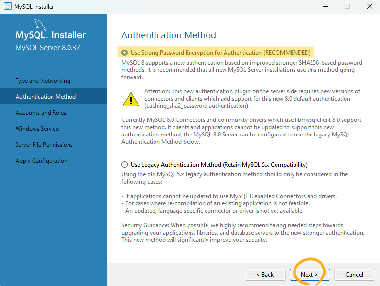 - Authentication Method에서는 인증 방식을 선택할 수 있는데, MySQL 8 버전부터 새로운 인증 방식이 도입되었기 때문에 새로운 인증 방식을 사용할 것인지 이전 버전과 호환이 되는 인증 방식을 사용할 것인지 선택해야 한다.