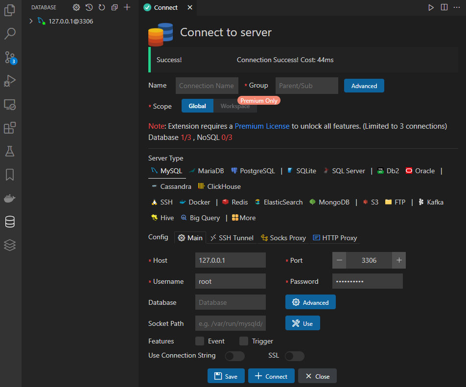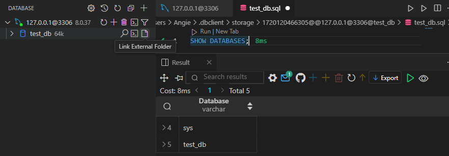 - 연결이 성공적으로 완료되면 상단에 Success! Connection Success! 문구가 나타나고, 왼쪽 목록에 연결된 데이터베이스가 보인다.