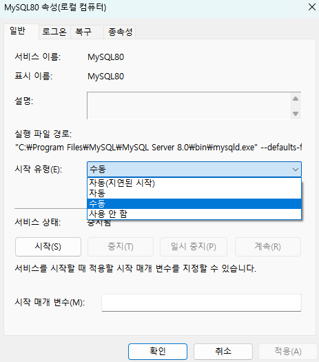 MySQL 서버는 처음 설치하면 자동으로 서버가 시작되게 설정된다. MySQL 서버를 필요한 시점에만 서버를 실행하거나 종료하고 싶다면 수동으로 설정을 바꾸면 된다.