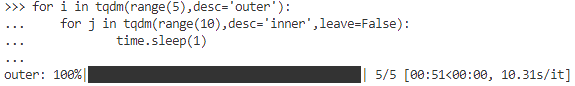 - 바깥쪽 반복문을 outer, 안쪽 반복문을 inner라고 설정하고 inner에 대해서만 leave=False 옵션을 주면, 반복 중에는 progress bar가 보이지만 반복이 완료되면 inner progress bar가 사라진다.