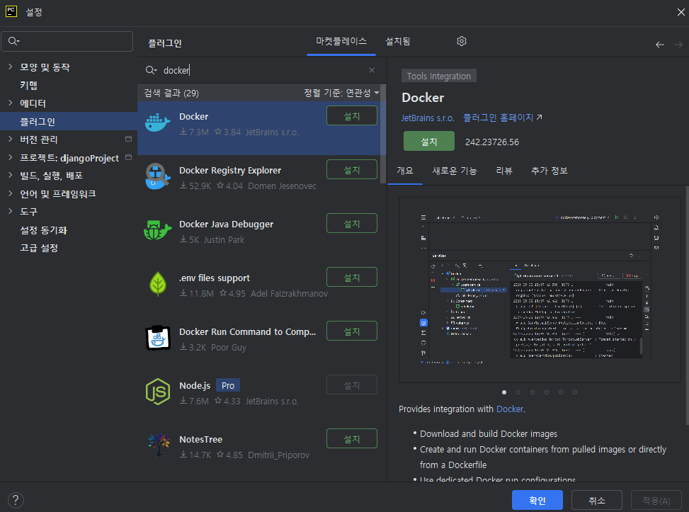 PyCharm에서 Docker 플러그인을 설치하는 과정은 다음과 같이 매우 간단하다.