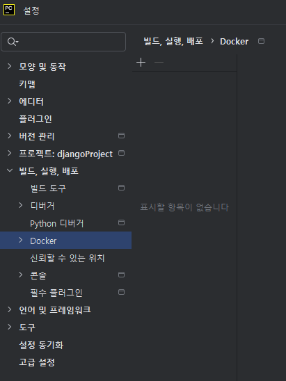- 적용이 완료되면, 아래 이미지와 같이 빌드(Build), 실행(Run), 배포(Deployment) 하위에 Docker 옵션이 추가된 것을 확인할 수 있다.