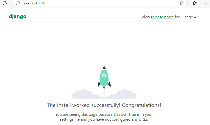 - 브라우저에서 http://localhost:8000으로 접속하면 Django 프로젝트가 실행 중인 것을 확인할 수 있다.