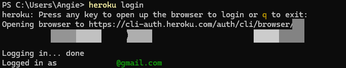 - 웹에서 Heroku 아이디와 비밀번호로 로그인을 완료하면, 쉘에서 아래 이미지와 같이 "Logging in ... done"이라는 메시지와 함께 로그인한 아이디가 표시된다.