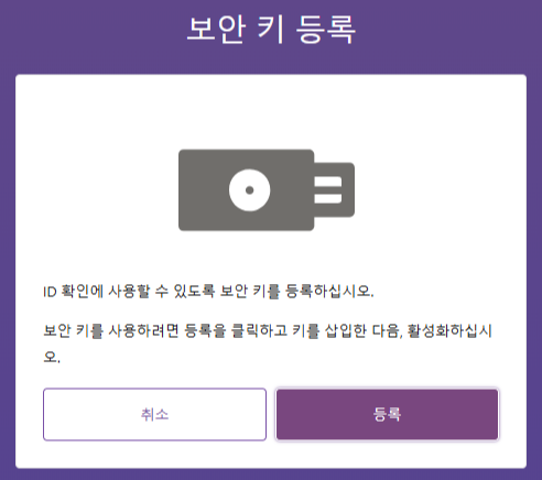 - 확인 방법 중 원하는 방식을 선택하면 되고, 3번째 옵션인 보안 키는 QR 코드를 통해 스마트폰과 연동하여 등록할 수 있다.
