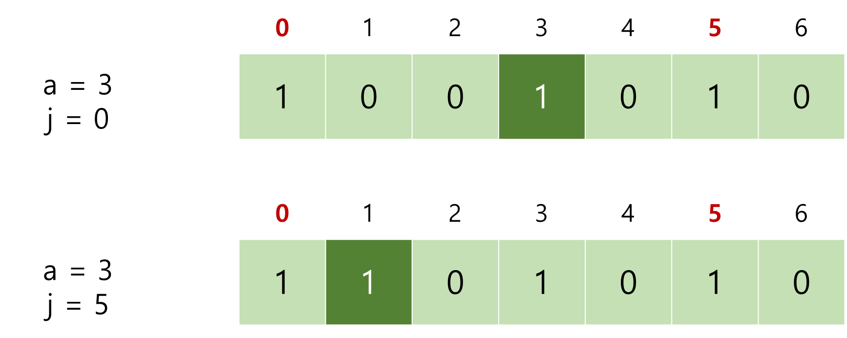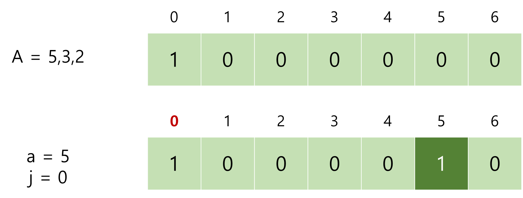 - 예시) A로 5,3,2 이 주어진다면, 아래 그림과 같이 연산된다. (j는 나머지 숫자가 존재함을 의미)