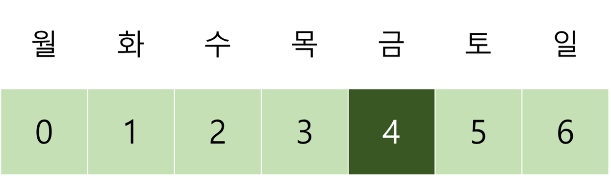 - 일주일은 7일이기 때문에 월요일부터 일요일을 0에서 6으로 둔다.