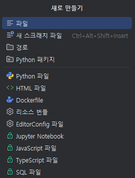 파일을 생성하려는 디렉토리에서 이 단축키를 누르면 아래 이미지와 같이 생성하려는 목록이 나온다.