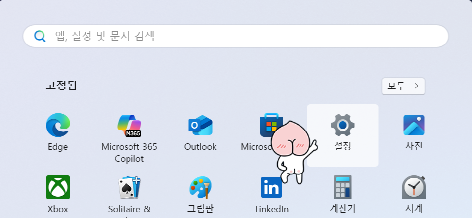 - 시작 메뉴에서 설정이 안보이면 검색해서 찾을 수 있다.