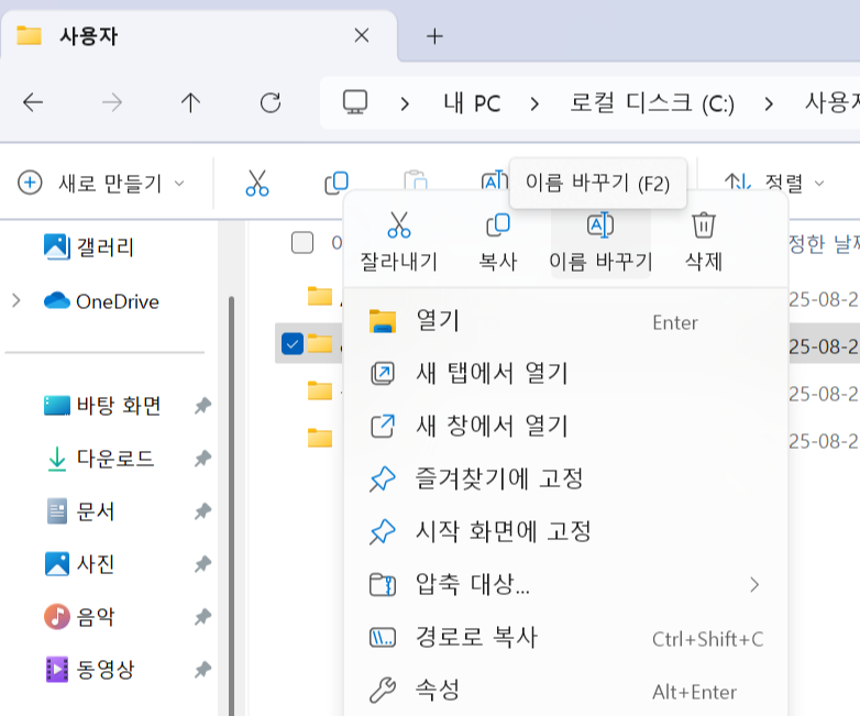 - 해당 사용자 폴더를 마우스 오른쪽 클릭하고 이름 바꾸기를 선택하여 레지스트리에서 설정한 이름과 동일하게 변경한다.