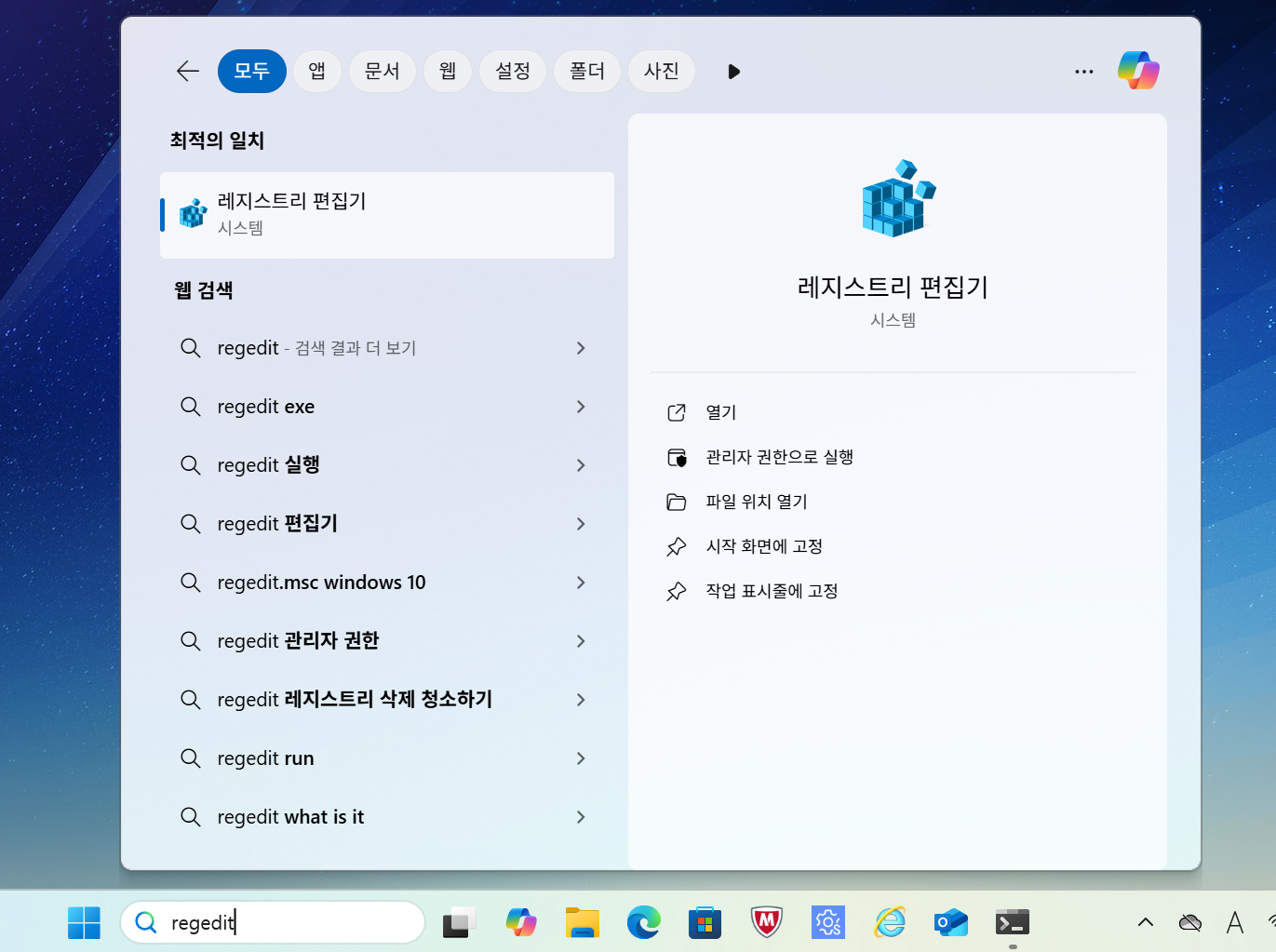 - Windows 검색창에 regedit을 입력해 레지스트리 편집기를 찾아서 연다.