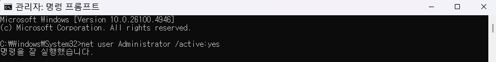 - 관리자 권한으로 명령 프롬프트를 열고 아래 명령어로 관리자 계정을 비활성화 한다.