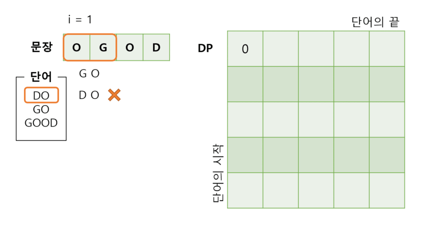 - 이때 주어진 단어의 길이가 다양하고 여러 번 쓰일 수 있음으로 2차원 배열을 활용한 DP를 통해 문제를 풀 수 있다.