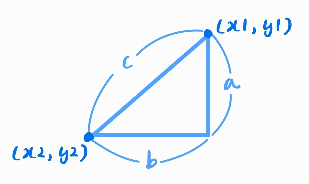 $c = \sqrt{(x1-x2)^2 + (y1-y2)^2}$