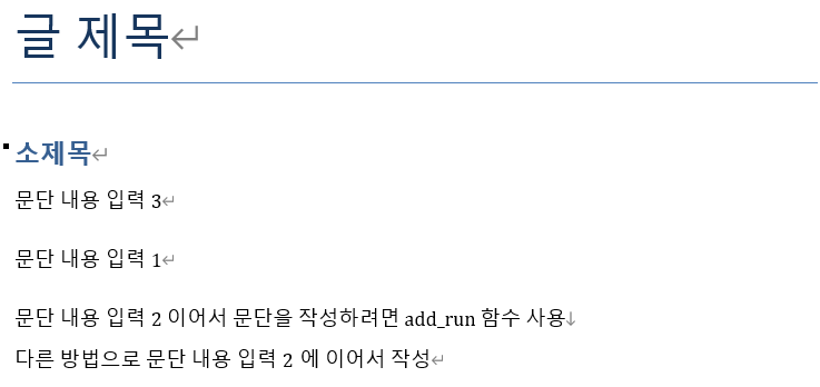 paragraph.add_run("\n다른 방법으로 문단 내용 입력2에 이어서 작성")