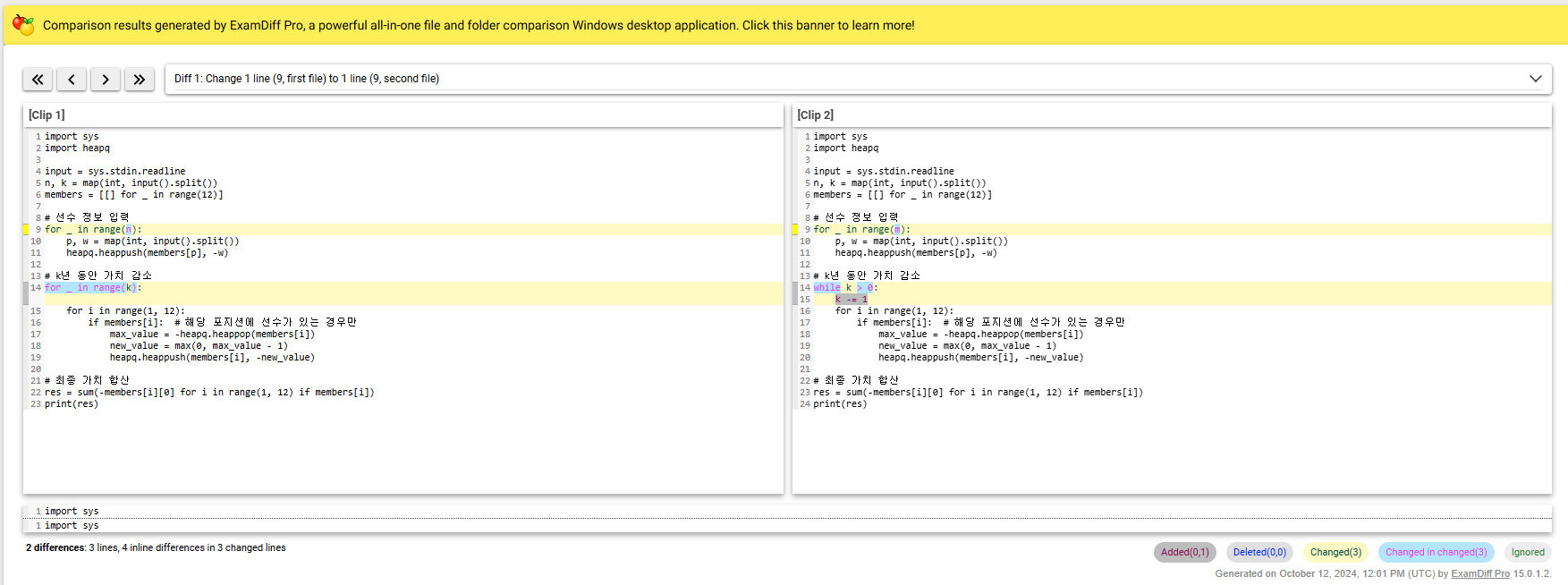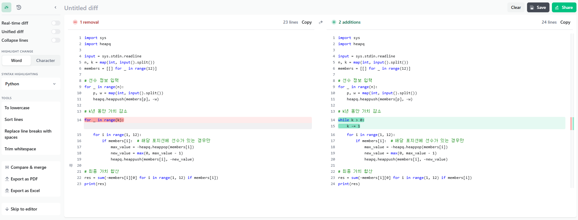 - 코드 비교 결과는 위의 이미지에서 보이는 것처럼 원본의 어떤 내용이 삭제되고 추가되었는지 표시된다.