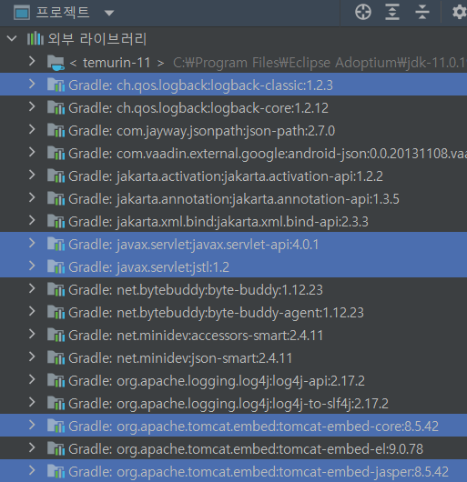 - 자바를 이용해 웹 애플리케이션을 만들기 위해서는 servlet이 필요함으로 servlet에 대한 의존성도 추가한다.