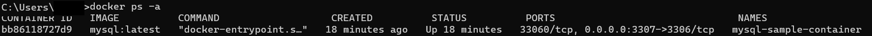 docker run --name mysql-sample-container -e MYSQL_ROOT_PASSWORD=test -d -p 3306:3306 mysql:latest