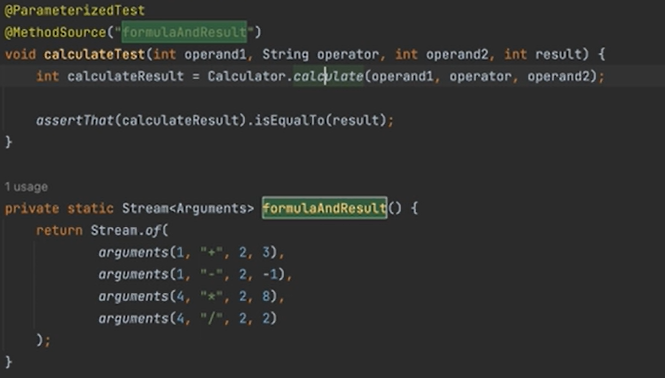 - Stream<Arguments>의 메소드를 통해 피연산자1, 연산자, 피연산자2, 결과값을 arguments로 MethodSource에 주고 calulateTest(피연산자1, 연산자, 피연산자2, 결과값)를 진행할 수 있다.