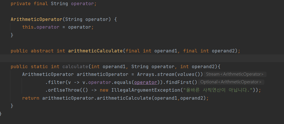 - enum을 활용하여 사칙연산 기호에 따라 피연산자들을 계산하도록 구현할 수 있다.