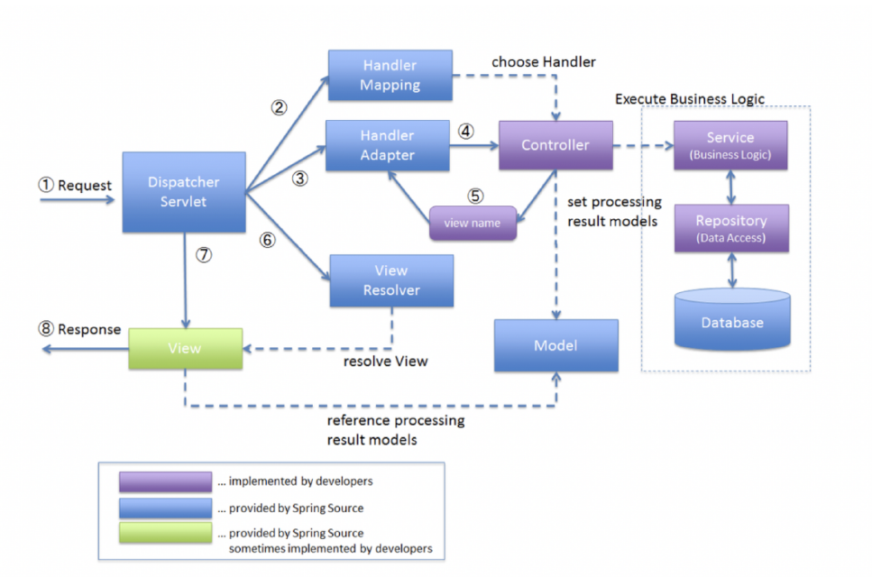 - 요청이 들어오면 Dispatcher Servlet이 요청을 받아 Handler Mapping을 통해 적절한 핸들러(컨트롤러)를 찾아 보내게 된다.